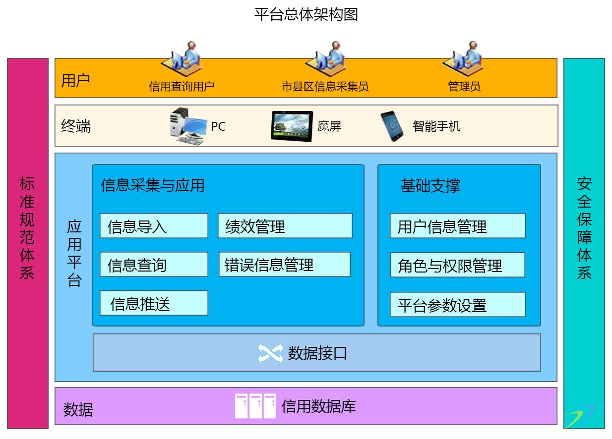 平臺的主要用戶為信用查詢用戶、市縣區(qū)信息采集員,平臺管理員。用戶通過終端訪問應(yīng)用平臺各項(xiàng)功能,包括信用信息查詢、導(dǎo)入、推送、錯誤信息管理;管理員可進(jìn)行信用歸集績效管理,平臺設(shè)置。平臺提供數(shù)據(jù)接口,與外部應(yīng)用進(jìn)行信息交換。